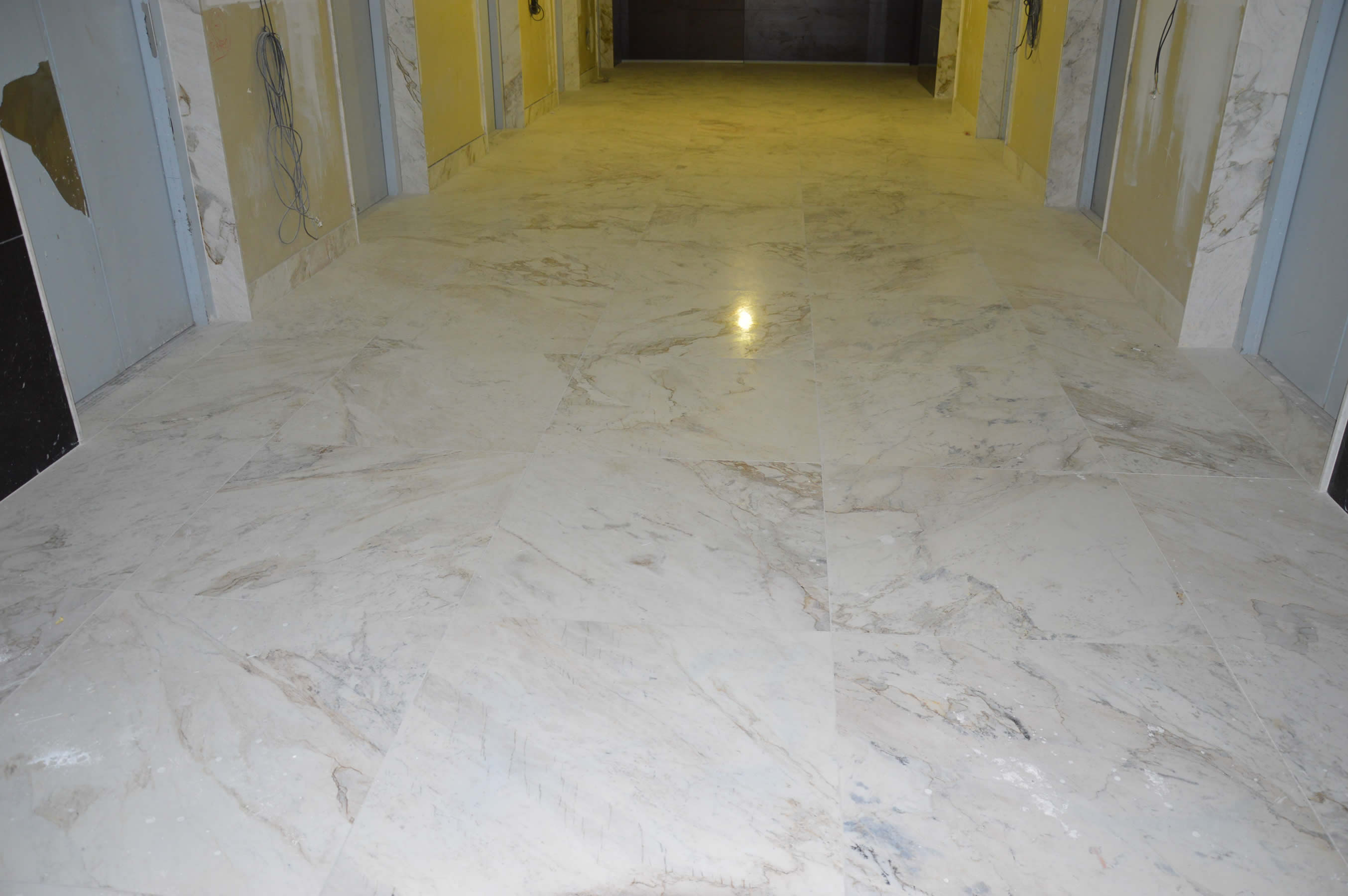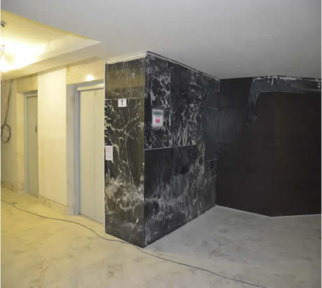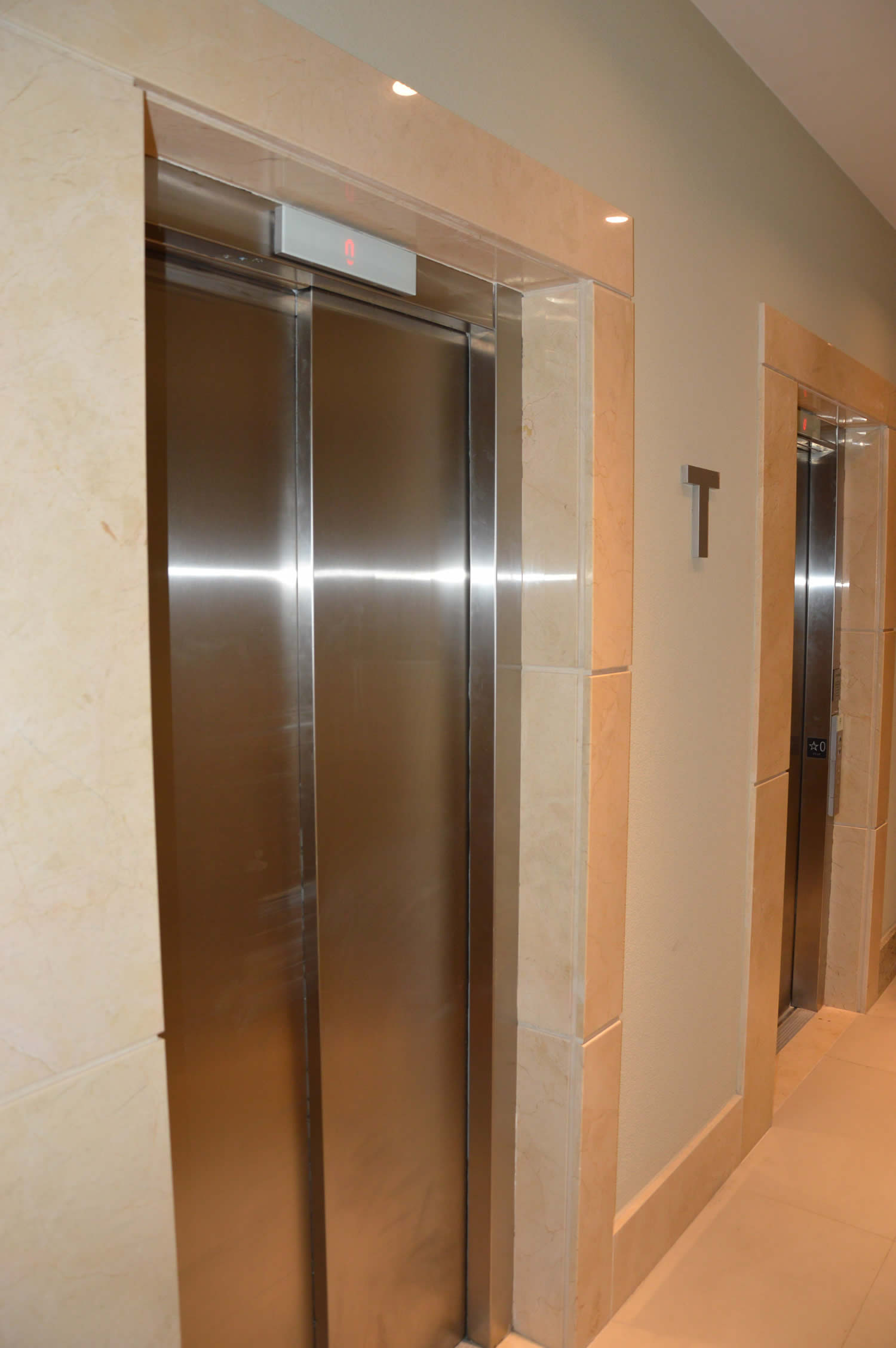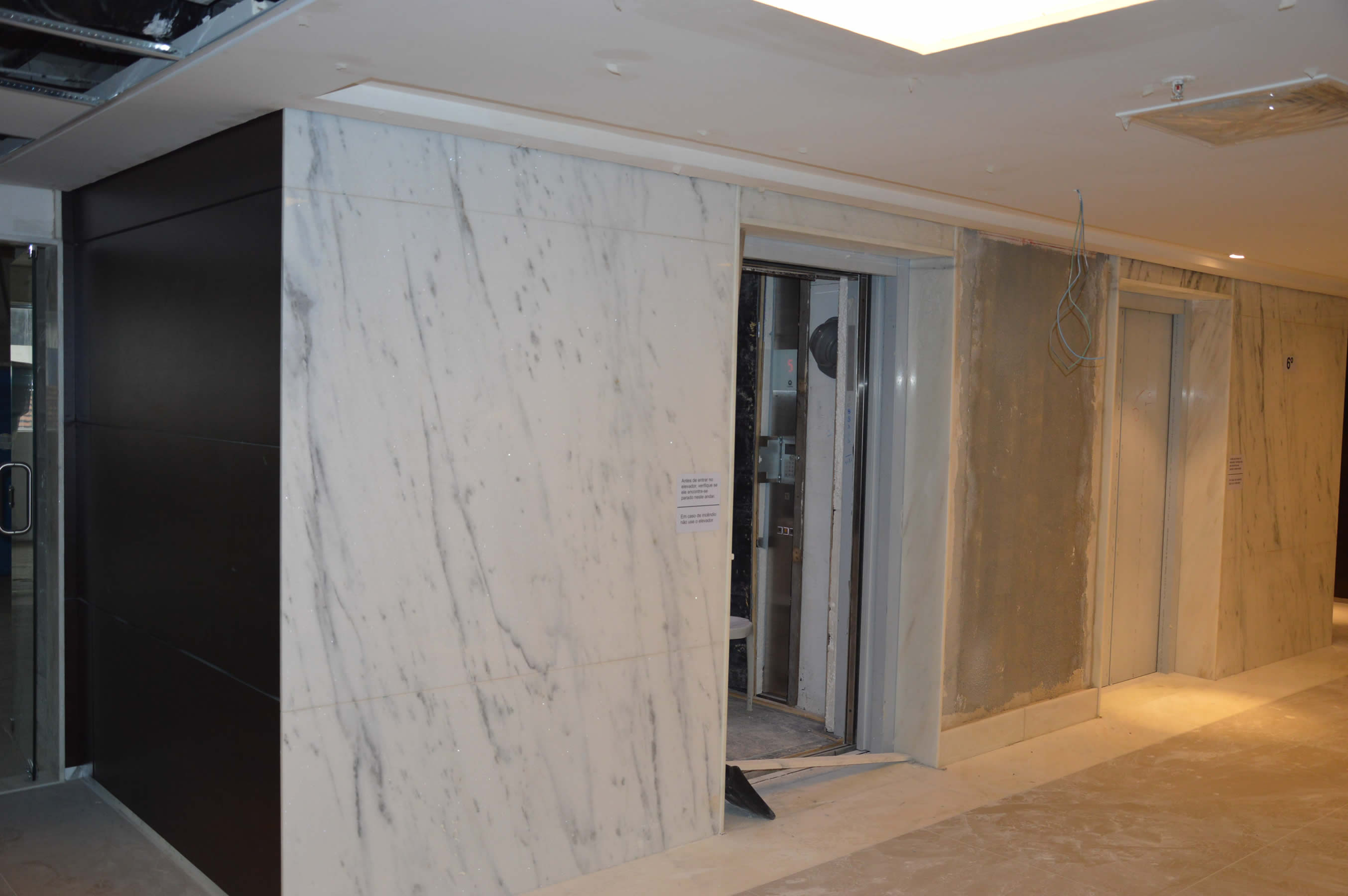 Dominus -Passeio Corporate - Detalhe do hall dos elevadores em piso e rodapés de mármore Branco Paraná