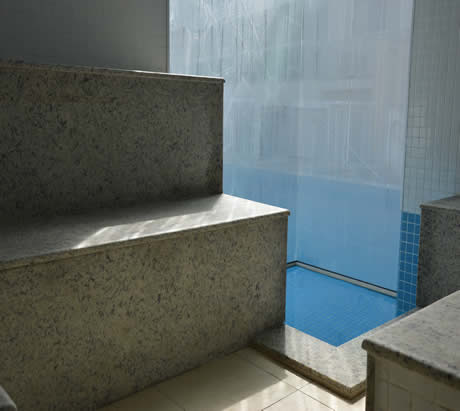 Dominus -Passeio Corporate - Piso em Mármore Branco Paraná e paredes revestidas em nármore Nero Marquina